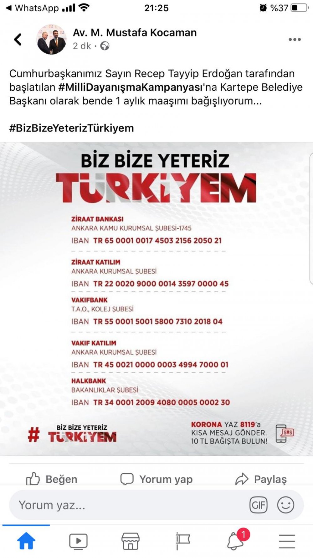 Kocaman sosyal medya hesabından yaptığı duyuruyla Cumhurbaşkanı Erdoğan’ın çağrısına karşılık 1 aylık belediye başkanlığı maaşını kampanya kapsamında bağışladığını ilan etti. Bakanlar Kurulu'nu video konferans yoluyla toplayan Cumhurbaşkanı Recep Tayyip Erdoğan, yeni tip koronavirüs salgınına karşı alınan önlemlerle ilgili Ulusa Sesleniş konuşması yaptı. Cumhurbaşkanı Erdoğan konuşmasında, ihtiyaç sahiplerine destek olmak amacıyla "Biz bize yeteriz Türkiyem" diyerek Milli Dayanışma Kampanyası'nın başlatıldığını ifade etti. Erdoğan kampanyadaki amacın, yevmiye ile geçimini sürdüren kesimler başta olmak üzere, alınan tedbirlerden dolayı mağdur olan dar gelirli vatandaşlara ilave destek sağlamak olduğunu söyledi.