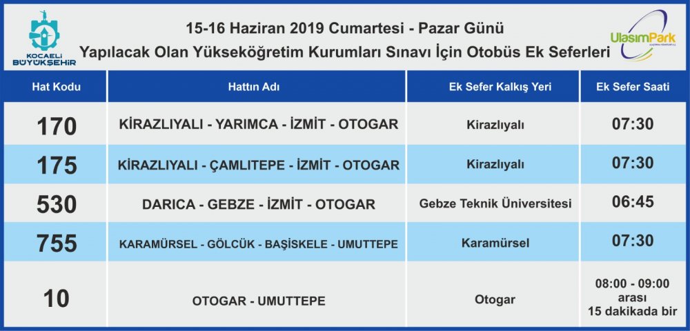 UlaşımPark tarafından alınan karara göre 170 numaralı hat saat 7.30’da Kirazlıyalı’dan kalkış yaparak Yarımca, İzmit güzergâhından Otogar’a ulaşacak. Yine aynı saatte 175 numaralı hat da Kirazlıyalı’dan kalkış sağlayacak ve Çamlıtepe üstünden İzmit ve son olarak Otogar’a gidecek. 530 numaralı hat ise 06.45’de Gebze Teknik Üniversitesi’nden kalkarak sırasıyla Darıca, Gebze, İzmit üstünden Otogar’a ulaşacak. 755 numaralı hat da 07.30’da Karamürsel’den kalkış yaparak Gölcük ve Başiskele güzergahından Umuttepe’ye ulaşacak. Son olarak 10 numaralı hat, 08.00 – 09.00 saatleri arası Otogar’dan her 15 dakikada bir Umuttepe’ye doğru yola çıkacak.
