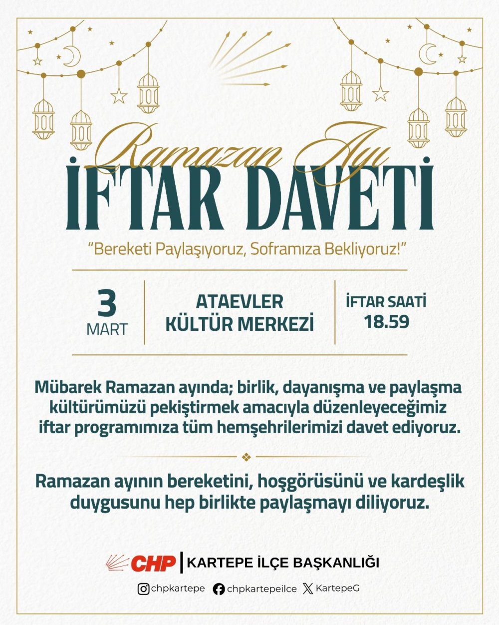 “Bereketi Paylaşıyoruz, Soframıza Bekliyoruz” sloganıyla düzenlenen organizasyonda, Ramazan ayının bereketinin, hoşgörüsünün ve kardeşlik duygusunun hep birlikte paylaşılması hedefleniyor. CHP Kartepe İlçe Başkanı Cihan Çakır tarafından yapılan davette, “Birlik, dayanışma ve paylaşma kültürümüzü pekiştirmek amacıyla düzenleyeceğimiz iftar programımıza tüm hemşehrilerimizi davet ediyoruz” ifadelerine yer verfi. Programın, Kartepe’de toplumsal dayanışmayı güçlendiren önemli buluşmalardan biri olması bekleniyor.