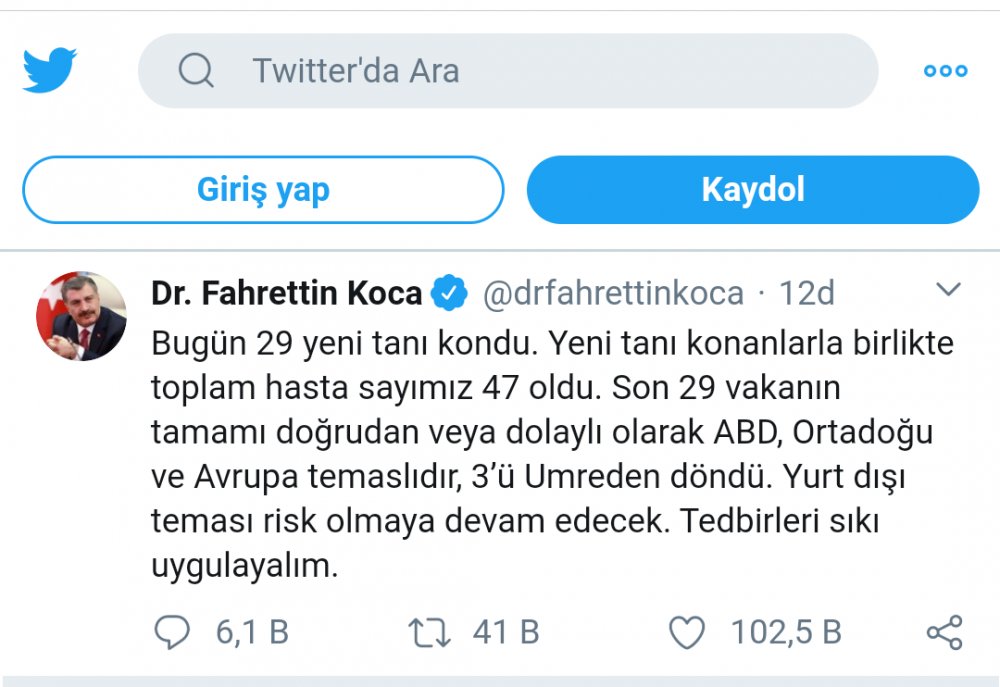 Son 29 vakanın tamamı doğrudan veya dolaylı olarak ABD, Ortadoğu ve Avrupa temaslıdır, 3’ü Umreden döndü. Yurt dışı teması risk olmaya devam edecek. Tedbirleri sıkı uygulayalım" açıklamalarında bulundu.