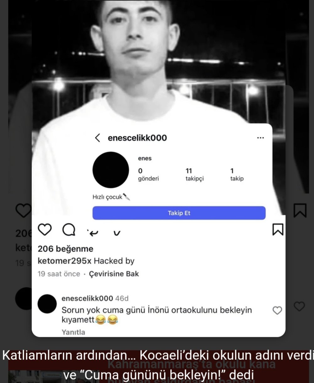 Şanlıurfa’daki saldırıyı gerçekleştiren şahsın fotoğrafının altına yapılan bir yorum, endişeyi daha da büyüttü. Kimliği henüz belirlenemeyen bir kişi, açıkça okulun adını vererek“Cuma günü Gebze İnönü Ortaokulu’nu bekleyin, kıyamet” ifadelerini kullandı.Kısa sürede yayılan ekran görüntüleri, özellikle öğrenci velileri arasında büyük korkuya neden oldu.