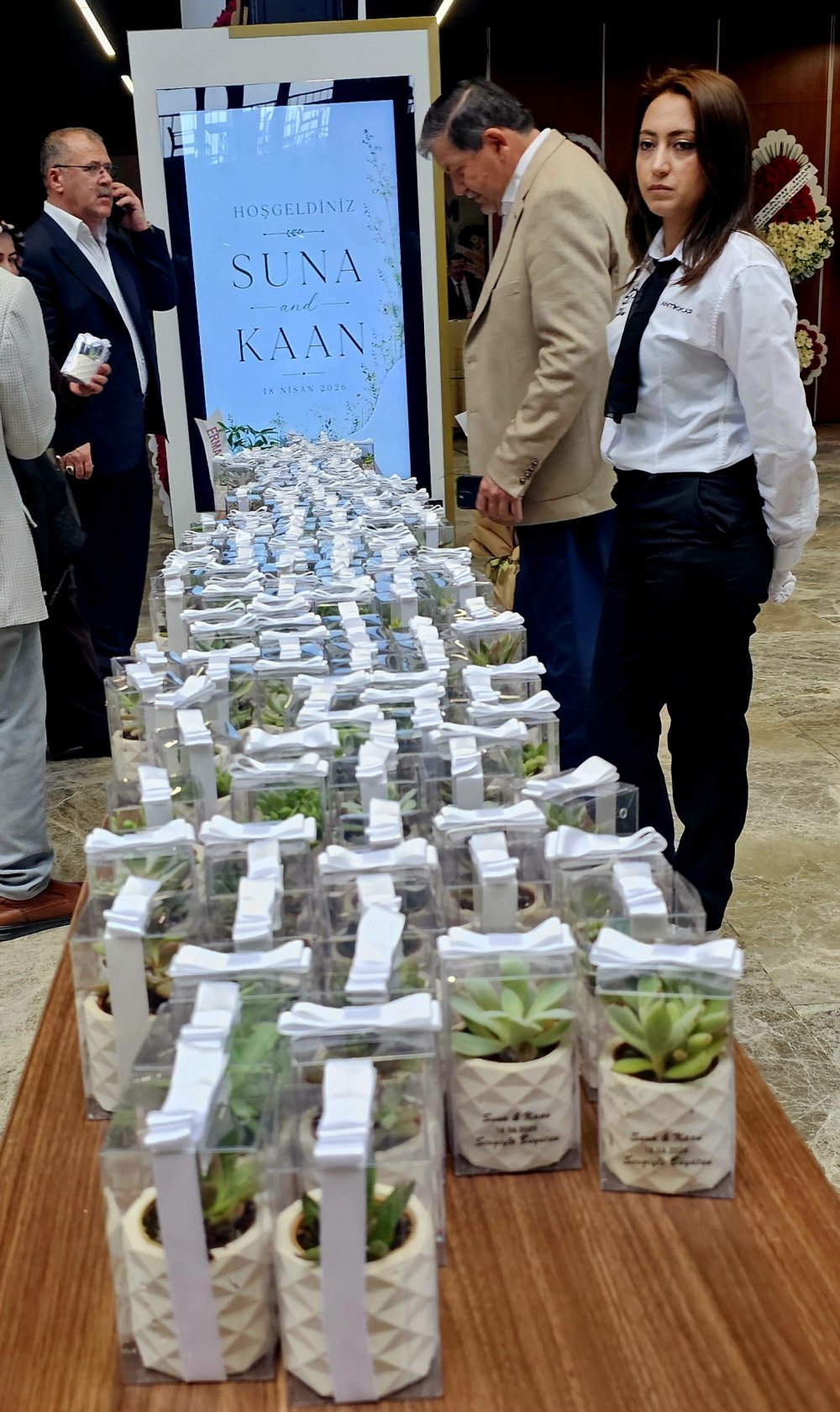 Nikâh töreninin ardından davetlilere anlamlı bir hatıra sunuldu. Çift, klasik nikâh şekeri yerine çevre dostu bir tercih yaparak yaklaşık 5 bin adet sukulent çiçek dağıttı. Misafirler, bu özel günü kalıcı bir hatırayla uğurlarken, dağıtılan sukulentler de davetlilerden büyük beğeni topladı. Nikahta ikram kusursuz gerçekleşirken genç çiftin nikahına olan ilgi sebebiyle davetlilet salona sığmadığı dikkat çekti.