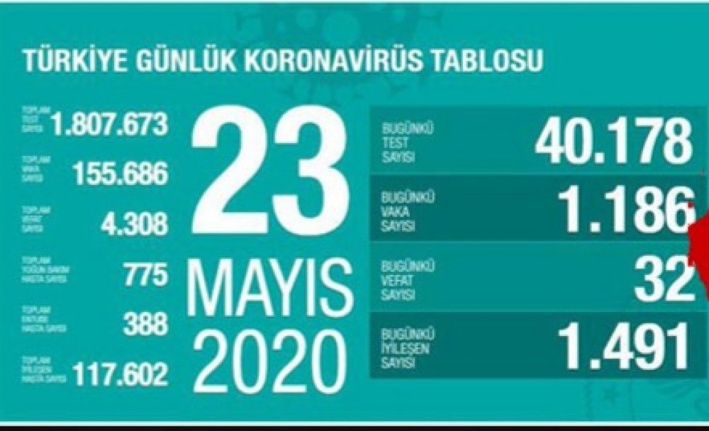 Sağlık Bakanlığının internet sitesinde yer alan ve Sağlık Bakanı Fahrettin Koca'nın da Twitter'dan paylaştığı "Türkiye Günlük Koronavirüs Tablosu"nun güncel verilerine göre, bugün 24 bin 589 test yapıldı ve 1141 kişiye Kovid-19 tanısı konuldu. Son 24 saatte 32 hasta vefat etti, 1092 hasta iyileşti. Toplam test sayısı 1 milyon 832 bin 262, vaka sayısı 156 bin 827 ve vefat sayısı 4 bin 340 oldu. Yoğun bakımdaki hasta sayısı 769, solunum cihazına bağlı hasta sayısı 385 ve iyileşen hasta sayısı 118 bin 694 olarak kayıtlara geçti.