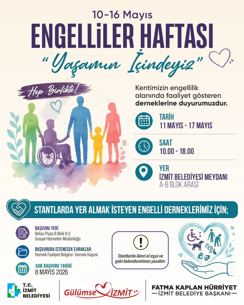 11–17 Mayıs tarihleri arasında İzmit Belediye Meydanı A-B blokları arasında kurulacak stantlarda engelli dernekleri yer alacak. Sosyal Hizmetler Müdürlüğü koordinasyonunda her gün 10.00-18.00 saatleri arasında gerçekleştirilecek etkinlikte ziyaretçiler, derneklerin çalışmalarını yakından tanıma fırsatı bulurken aynı zamanda dayanışmaya katkı sağlayabilecek.