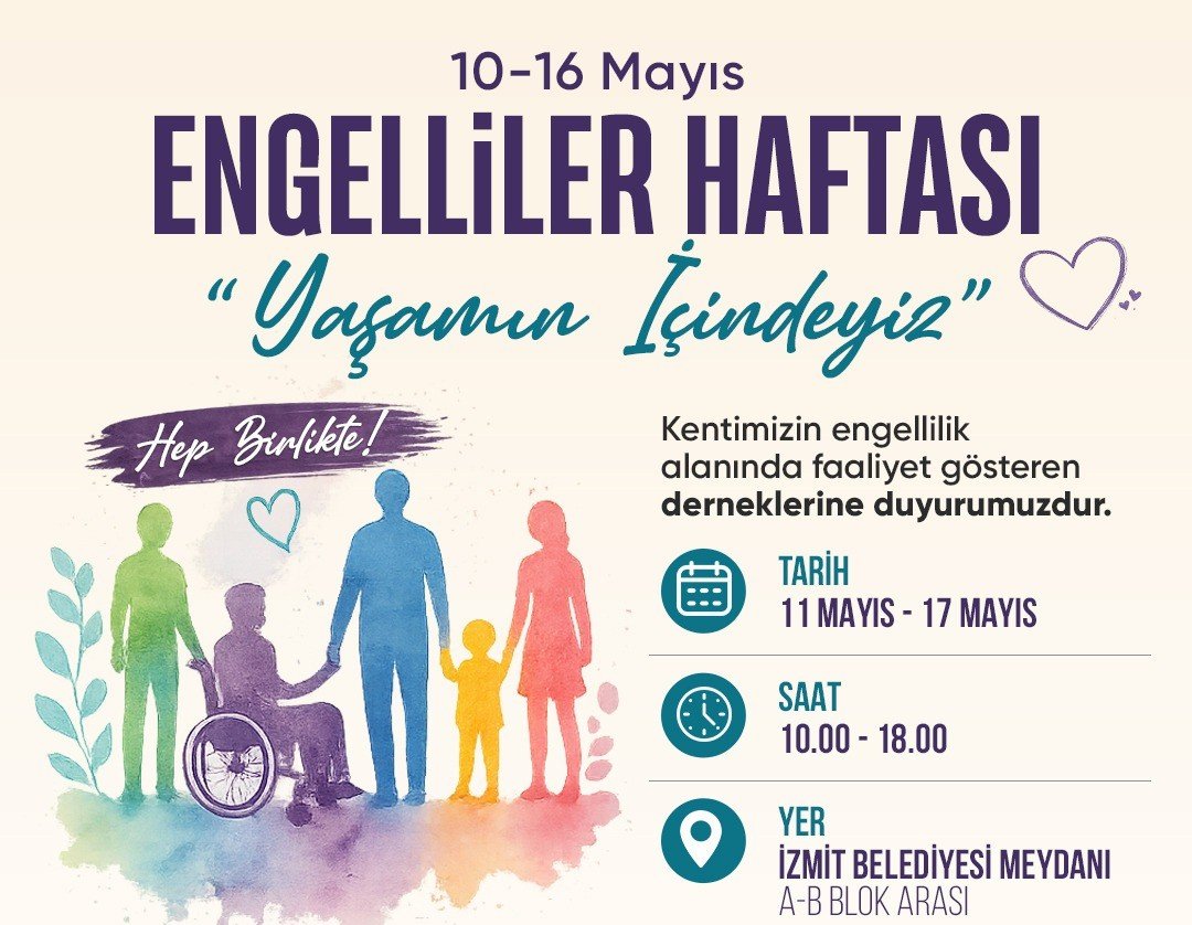 İzmit Belediyesi Sosyal Hizmetler Müdürlüğü, 10–16 Mayıs Engelliler Haftası kapsamında anlamlı bir etkinliğe ev sahipliği yapacak. “Yaşamın İçindeyiz” sloganıyla düzenlenecek organizasyonda, kentte faaliyet gösteren engelli dernekleri bir araya gelerek hem farkındalık oluşturacak hem de el emeği ürünlerini vatandaşlarla buluşturacak.