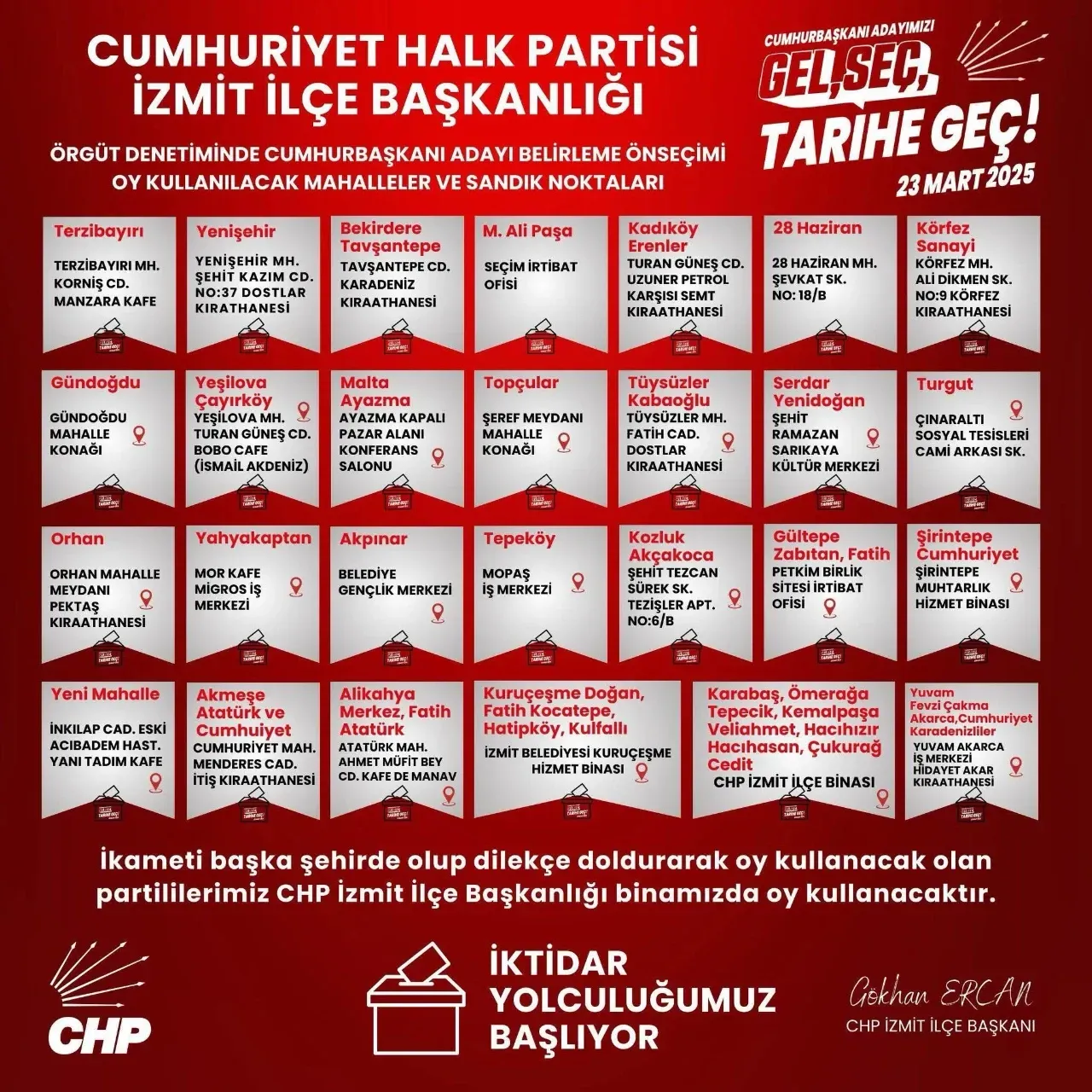 CHP İzmit İlçe Başkanı Gökhan Ercan ilçe binasında yaptığı açıklamada tüm vatandaşları ön seçimde oy kullanmaya davet ederek, “Pazar günü Pazar günü İzmit’te 27 mahallede sandık kuracağız. Bu sandıkların hepsinin yanında dayanışma sandığı olacak, toplam 60 sandıkta vatandaşlarımız oylarını kullanabilecek.” dedi.