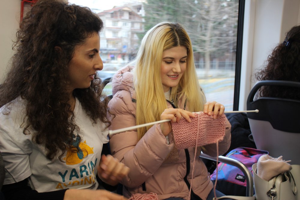 Yarını Aydınlat Gençlik Platformu üyesi öğrenciler, maddi durumu kötü olan öğrenciler için tramvayda atkı, bere ve eldiven örerek farkındalık oluşturdu.