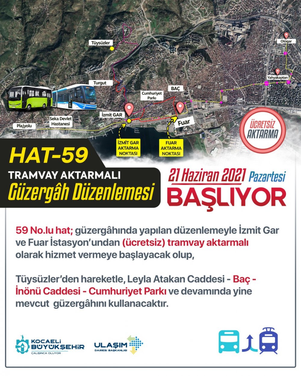 59 no’lu hat güzergahında yapılan düzenleme ile 21 Haziran Pazartesi günü itibariyle İzmit Gar ve Fuar istasyonundan ücretsiz tramvay aktarmalı olarak hizmet vermeye başlayacak.