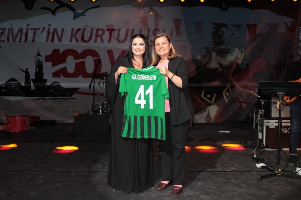 Gençlerin sahneye çıkarak hünerlerini sergilediği, tüm vatandaşların doyasıya eğlendiği konserde Hürriyet, güzel sesiyle kulakların pasını silen Gül Özgüner Altın’a Kocaelispor forması ve plaket takdim etti. İzmit’in değeri Altın, “Gözlerim doldu, çok heyecanlıyım. Doğup büyüdüğüm İzmit’in düşman işgalinden kurtuluşunun 100. yılında sahnedeyim. Bu benim için inanılmaz büyük bir mutluluk. Bu mutluluğu yaşattığı için İzmit Belediye Başkanımız Fatma Kaplan Hürriyet’e teşekkür ediyorum. İzmit’in düşman işgalinden kurtuluşunun 100. yılı kutlu olsun” şeklinde konuştu.