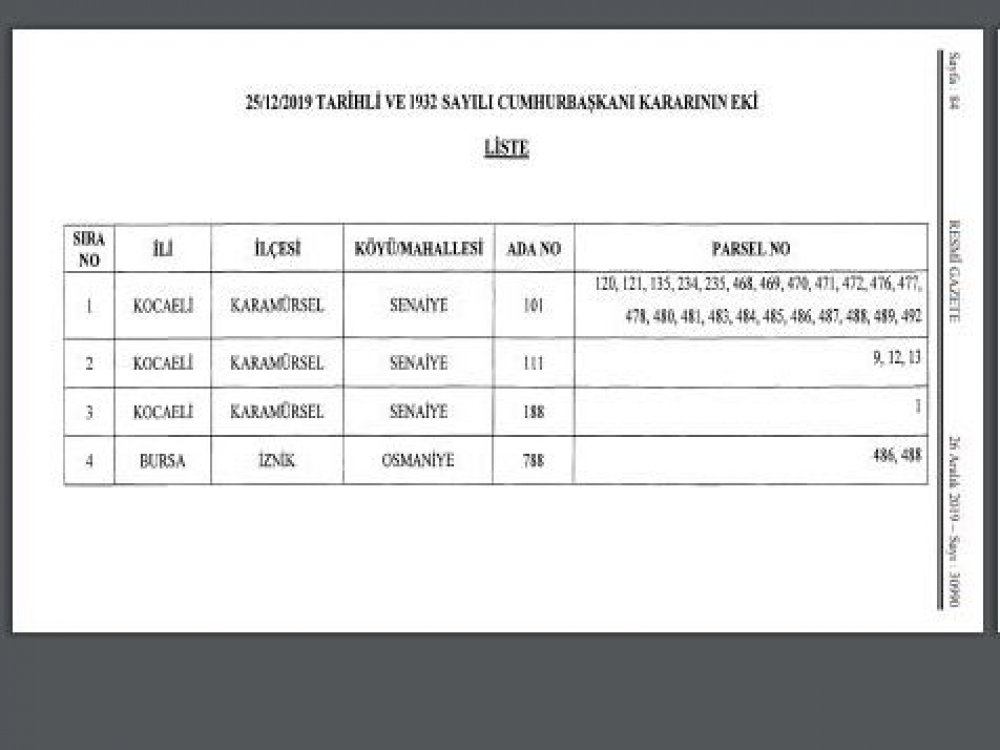 Bugün yayımlanan Resmi Gazete'de Cumhurbaşkanı Recep Tayyip Erdoğan'ın imzasıyla çıkan karara göre; Karamürsel Rüzgar Enerji Santralinin yapımı amacıyla Kocaeli ve Bursa'da yer alan ada ve parsellerdeki taşınmazların tapuda Hazine adına tescil edilmek üzere Çevre ve Şehircilik Bakanlığı tarafından acele kamulaştırılmasına karar verildi. Buna göre Karamürsel Senaiye köyündeki 101 Ada 120, 121, 135, 234, 235, 468, 469, 470, 471, 472, 476, 477, 478, 480, 481, 483, 484, 485, 486, 487, 488 ve 492 nolu parsellerdeki yerler, yine Senaiye köyündeki 111 Ada 9, 12 ve 13 nolu parseller ile 1 nolu parsel ile Bursa İznik Osmaniye köyündeki 788 Ada 486 ve 488 parsel nolu taşınmazlar acele kamulaştırıldı.