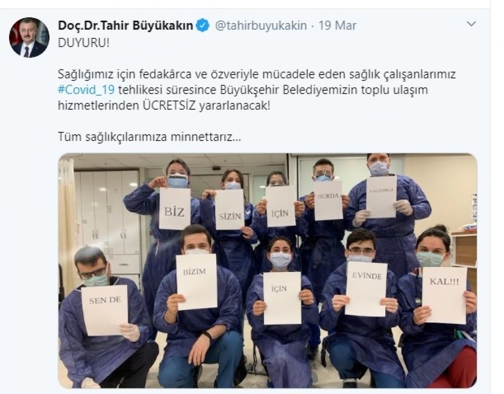 Toplum sağlığı için fedakârca ve özverili bir şekilde mücadele eden sağlık çalışanlarını da unutmayan Başkan Doç. Dr. Büyükakın, sağlık çalışanlarının Büyükşehir Belediyesi toplu ulaşım hizmetlerinden ücretsiz yararlanacağını belirtti.