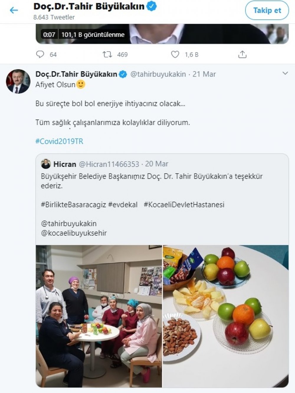 Başkan Büyükakın ayrıca sağlık çalışanlarına müteşekkiriz diyerek başladığı bir sosyal medya mesajında çalışanlara koruyucu ekipmanlarını KO-MEK kurslarında üreteceklerini dile getirdi. Başkan Doç. Dr. Büyükakın sağlık çalışanlarına bol bol enerjiye ihtiyacınız olacak notuyla meyve ve kuruyemiş yolladı. Bu jesten dolayı mutlu olan sağlık çalışanları da Başkan Tahir Büyükakın’a teşekkür etti.