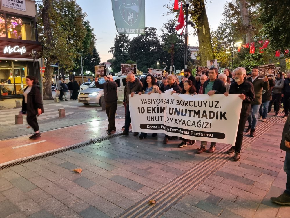 Kocaeli Emek ve Demokrasi Platformu, 10 Ekim 2015’te Ankara Garı’nda hayatını kaybeden 104 kişiyi yürüyüşle andı. Anmada “barış, adalet ve kardeşlik” vurgusu yapıldı. Anma etkinliği kapsamında İzmit Belediye İşhanı önünde toplanan grup, “Unutmadık, unutturmayacağız” sloganlarıyla İzmit İnsan Hakları Parkı’na yürüyüş gerçekleştirdi.Yürüyüşün ardından parkta yapılan basın açıklamasında, 10 Ekim’de yaşamını yitirenler anıldı; saldırının toplumsal bellekteki derin yaralarına ve adalet arayışının sürmesine vurgu yapıldı.“
