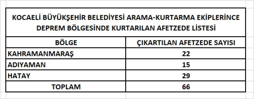 Kocaeli Büyükşehir Belediyesi ekipleri deprem bölgesi Kahramanmaraş, Gaziantep, Şanlıurfa, Diyarbakır, Adana, Adıyaman, Osmaniye, Hatay, Kilis, Malatya, Elazığ olmak üzere 11 bölgede arama kurtarma çalışmalarına aralıksız devam ediyor. Bölgede enkaz altında kalan 66 vatandaşımızın daha hayatını kurtardı.