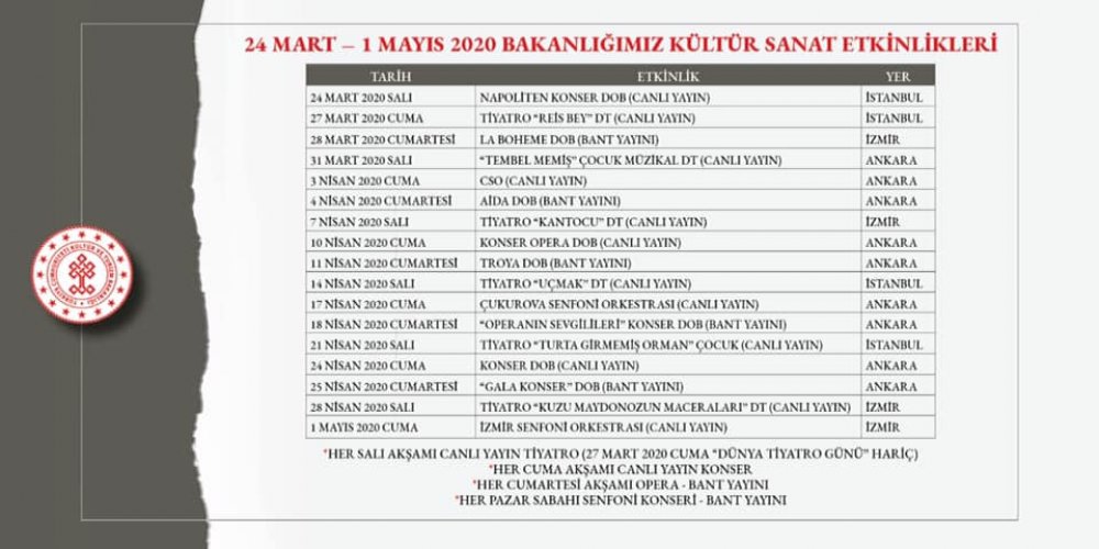 Kültür ve Turizm Bakanlığı, Koronavirüs ile mücadele kapsamında vatandaşları TRT ekranlarında kültür ve sanatla buluşturacak.