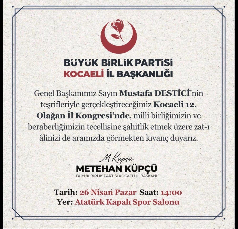 Büyük Birlik Partisi Kocaeli İl Başkanı Metehan Küpçü, 26 Nisan’da gerçekleştirilecek il kongresi öncesinde hazırlanan davet filmini kamuoyuyla paylaştı.