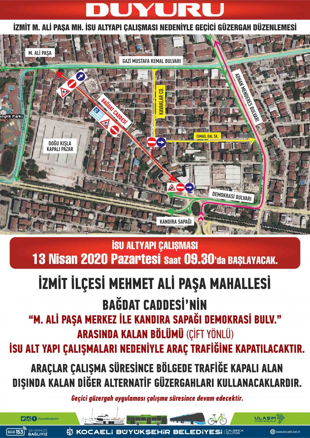 İzmit İlçesi Mehmet Ali Paşa Mahallesi’nde 2 ayrı yol İSU alt yapı çalışması nedeniyle kapatılacak. Çalışma kapsamında Mehmet Ali Paşa merkezi ile Kandıra Sapağı Demokrasi Bulvarı arasında kalan bölüm çift taraflı olarak araç trafiğine kapatılacak. Araçlar, çalışma süresince bölgede trafiğe kapalı alan dışında kalan diğer alternatif güzergahları kullanabilecek. Geçici güzergah uygulaması çalışma süresince devam edecek.