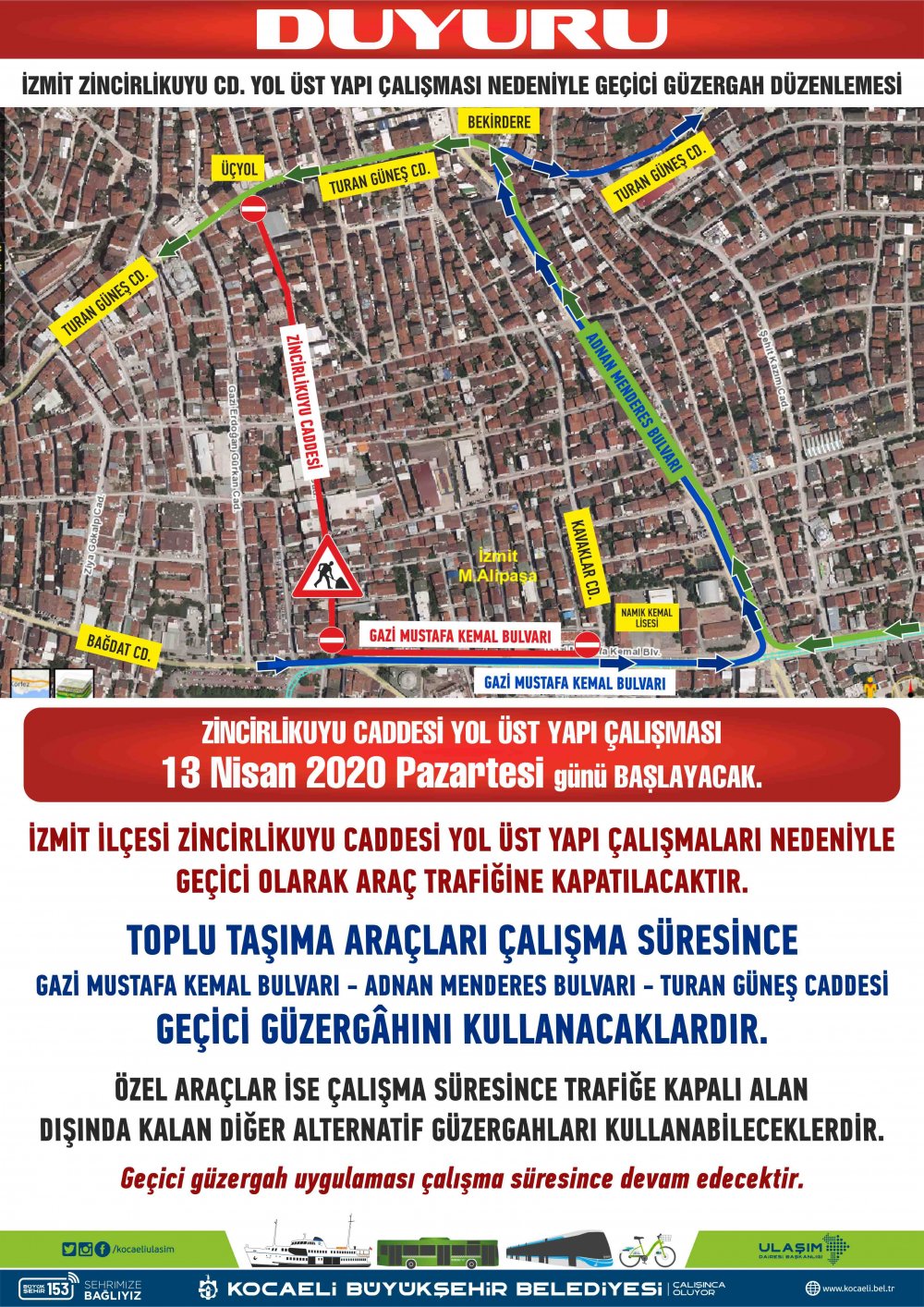 Bölgedeki ikinci çalışma ise Zincirlikuyu Caddesi’nde yapılacak. Zincirlikuyu Caddesi üst yapı çalışması nedeniyle kapatılacak. Bölgeyi kullanan toplu taşıma araçları için geçici güzergah oluşturuldu.