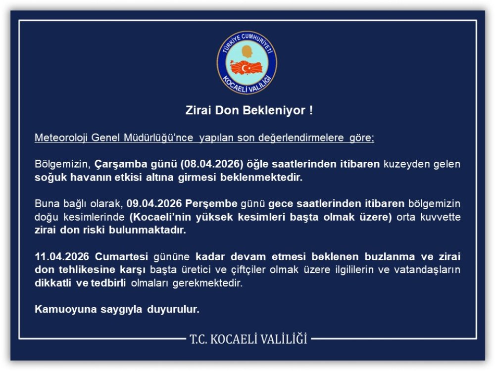 Bu hava değişimiyle birlikte, 09 Nisan Perşembe günü gece saatlerinden itibaren özellikle Kocaeli’nin yüksek kesimleri başta olmak üzere doğu bölgelerde orta kuvvette zirai don riski bekleniyor. Yetkililer, 11 Nisan Cumartesi gününe kadar süreceği öngörülen buzlanma ve don olaylarına karşı başta çiftçiler olmak üzere tüm vatandaşların dikkatli ve tedbirli olması gerektiğini vurguluyor.