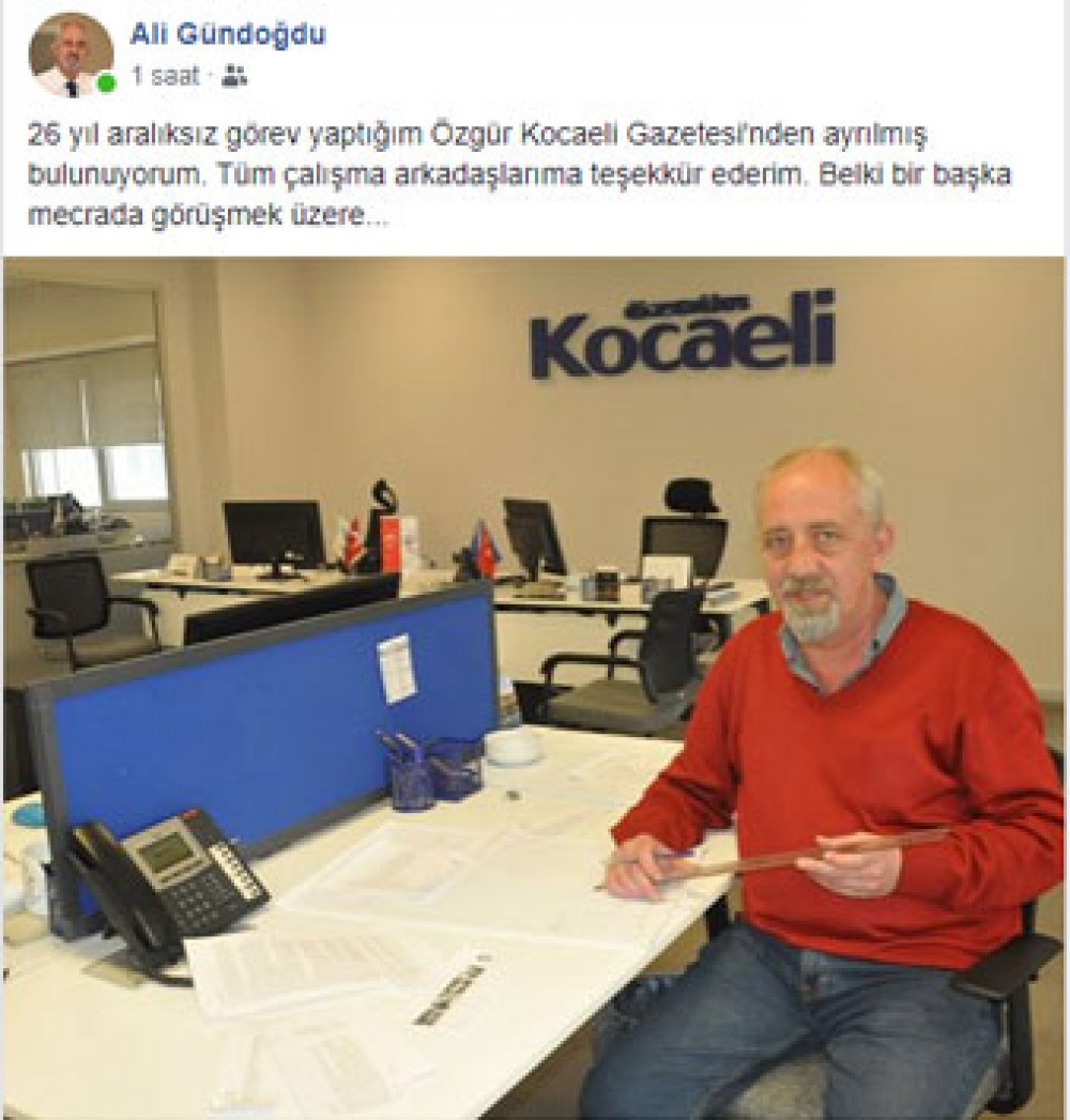 Gazetenin eski Genel Yayın Müdürü İsmet Çiğit’le birlikte uzun yıllar Özgür Kocaelİ’de editör, köşe yazarı olarak çalışan Ali Gündoğdu’ya gazetenin sahibi Haldız Grup yetkilileri tarafından “Artık sizinle çalışmayacağız“ denildi. 20 yılı aşkın süredir gazetede çalışan, Ali Gündoğdu’ya yasal haklarının vadeli çekler verilerek ödendiği öğrenildi. Gazetede çalışanlar arasında en kıdemli kişilerden biri olan Gündoğdu’nun da işten çıkarıldıktan sonra sosyal medya hesabında yaptığı paylaşımda şu sözlere yer verdi. "26 yıl aralıksız görev yaptığım Özgür Kocaeli Gazetesi'nden ayrılmış bulunuyorum. Tüm çalışma arkadaşlarıma teşekkür ederim. Belki bir başka mecrada görüşmek üzere..."
