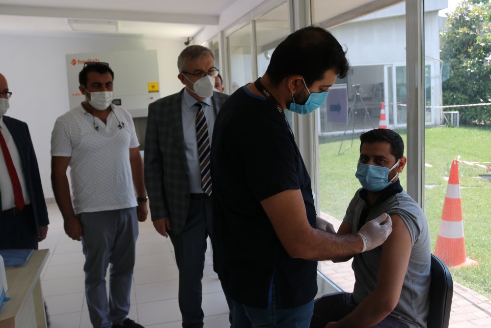 Hemen akabinde Dilovası’na geçen Pehlevan ilçede üretim yapan büyük sanayi kuruluşu Çolakoğlu Metalurji Demir Çelik fabrikasını ziyaret etti. Fabrikanın sağlık binası, aşılama noktası ve ilgili bazı birimlerinde aşılama çalışmalarını inceleyen Pehlevan’a Dilovası İlçe Sağlık Müdürü Dr. Mustafa Polat eşlik etti.