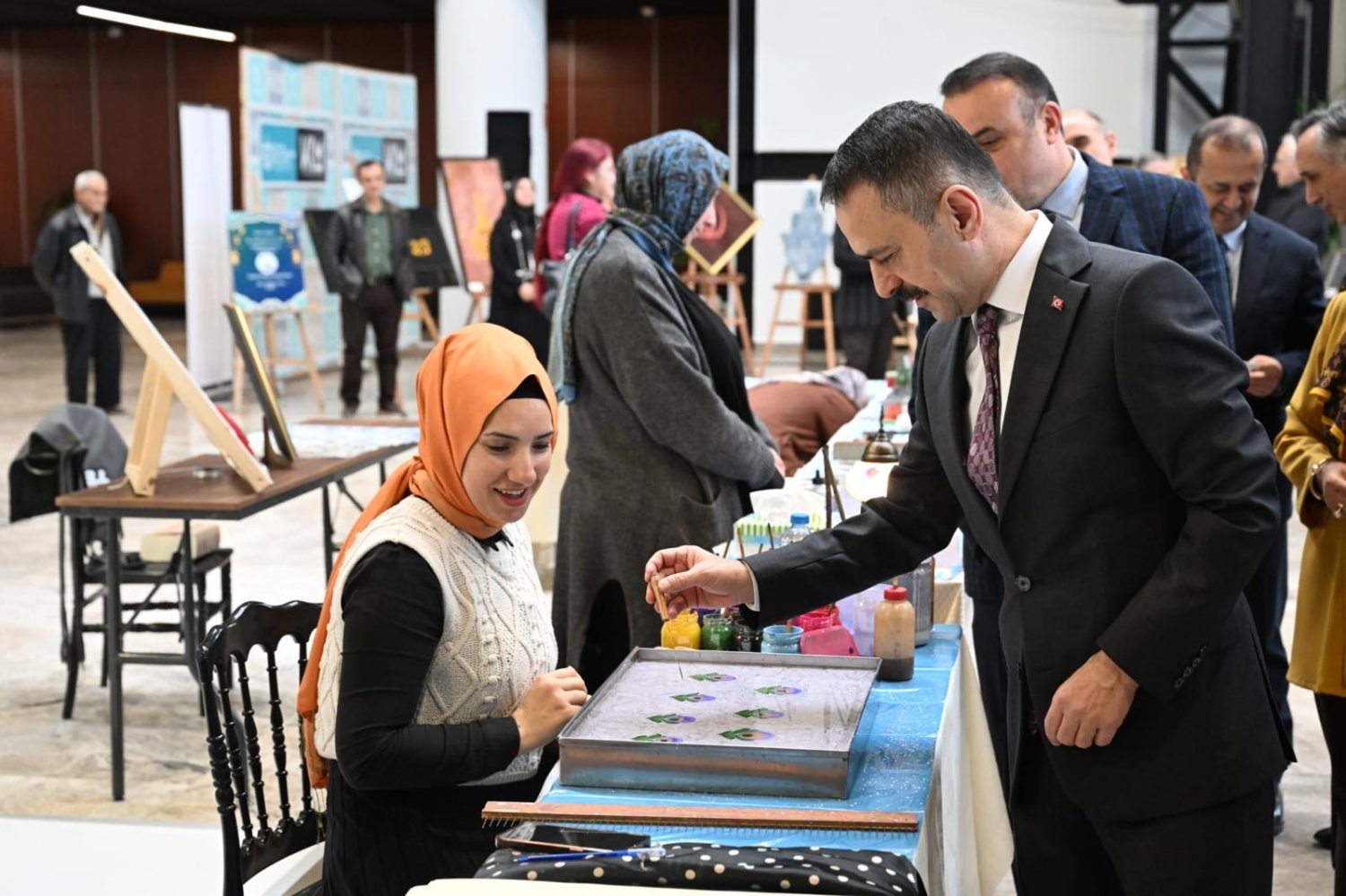 Vali Aktaş, program öncesinde İlçe Halk Eğitim Merkezlerindeki öğretmen ve kursiyerler tarafından hazırlanan ebru, hat ve tezhip eserlerinin yer aldığı “Sanatın Diliyle Değerlerimiz” sergisini ziyaret ederek emeği geçenleri tebrik etti.