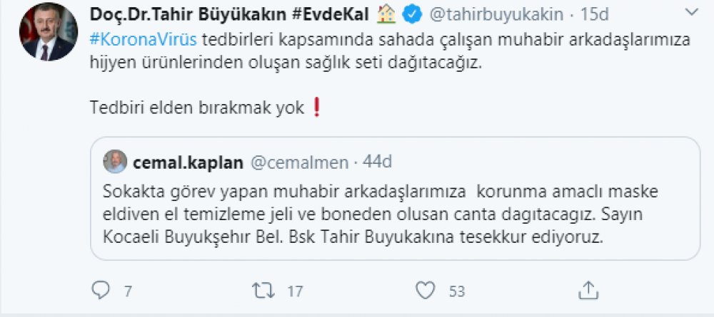 Bşkan Büyükakın Sosyal medya hesabından yaptığı paylaşımda şu ifadelere yer verdi: KoronaVirüs tedbirleri kapsamında sahada çalışan muhabir arkadaşlarımıza hijyen ürünlerinden oluşan sağlık seti dağıtacağız. Tedbiri elden bırakmak yok! açıklamasında bulundu.