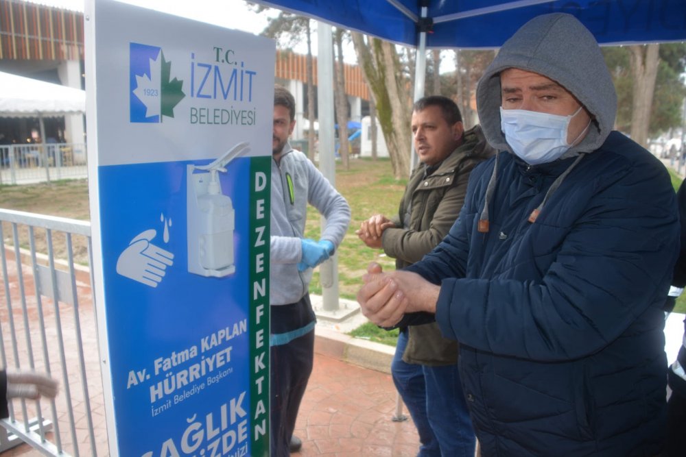 Pazar girişlerinde İzmit Belediyesi Zabıta Müdürlüğü ekipleri tarafından ücretsiz maske ve eldiven dağıtılırken vatandaşların ellerini temiz tutması, mikroplardan koruması adına İzmit Belediye Başkanı Av. Fatma Kaplan Hürriyet’in İzmit halkının hizmetine sunduğu dezenfektan otomatları da yer aldı. Pazara giriş ve çıkış yapan vatandaşlar bu otomatlarda ellerini dezenfekte etti.