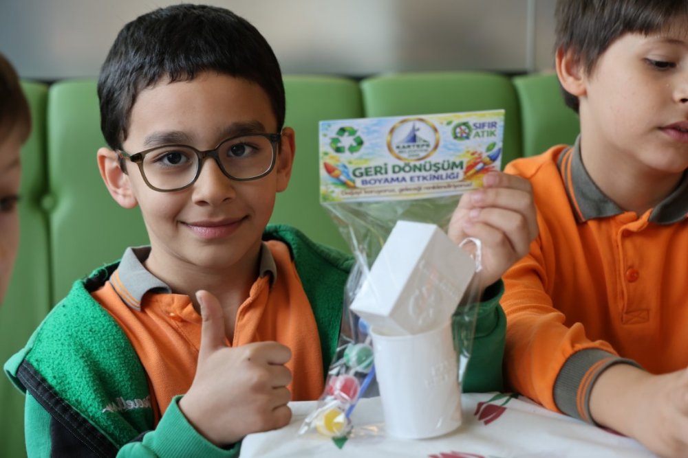 Etkinlik kapsamında Kartepe Belediyesi Temizlik İşleri Müdürlüğü tarafından çocuklara özel olarak hazırlanan geri dönüşüm temalı boyama kitleriyle öğrenciler sıfır atıkla ilgili farkındalık kazandı.