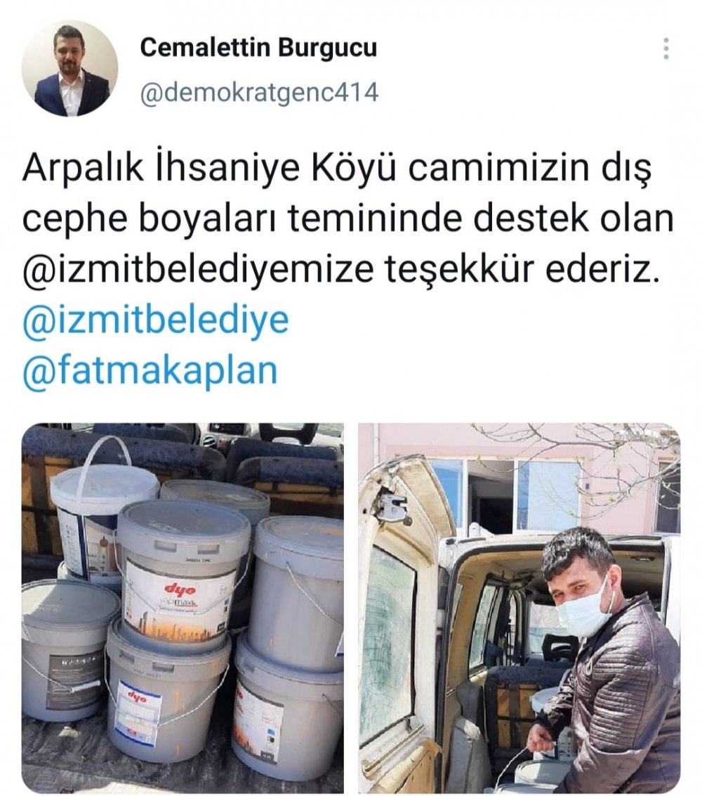 İzmit Belediye Başkanı Av. Fatma Kaplan Hürriyet'i etiketleyerek teşekkür mesajı paylaşan Burgucu, "Arpalık İhsaniye Köy Camii'mizin dış cephe boyalarını temin etmemizde bize destek olan İzmit Belediyesine teşekkür ederiz." ifadelerini kullandı.