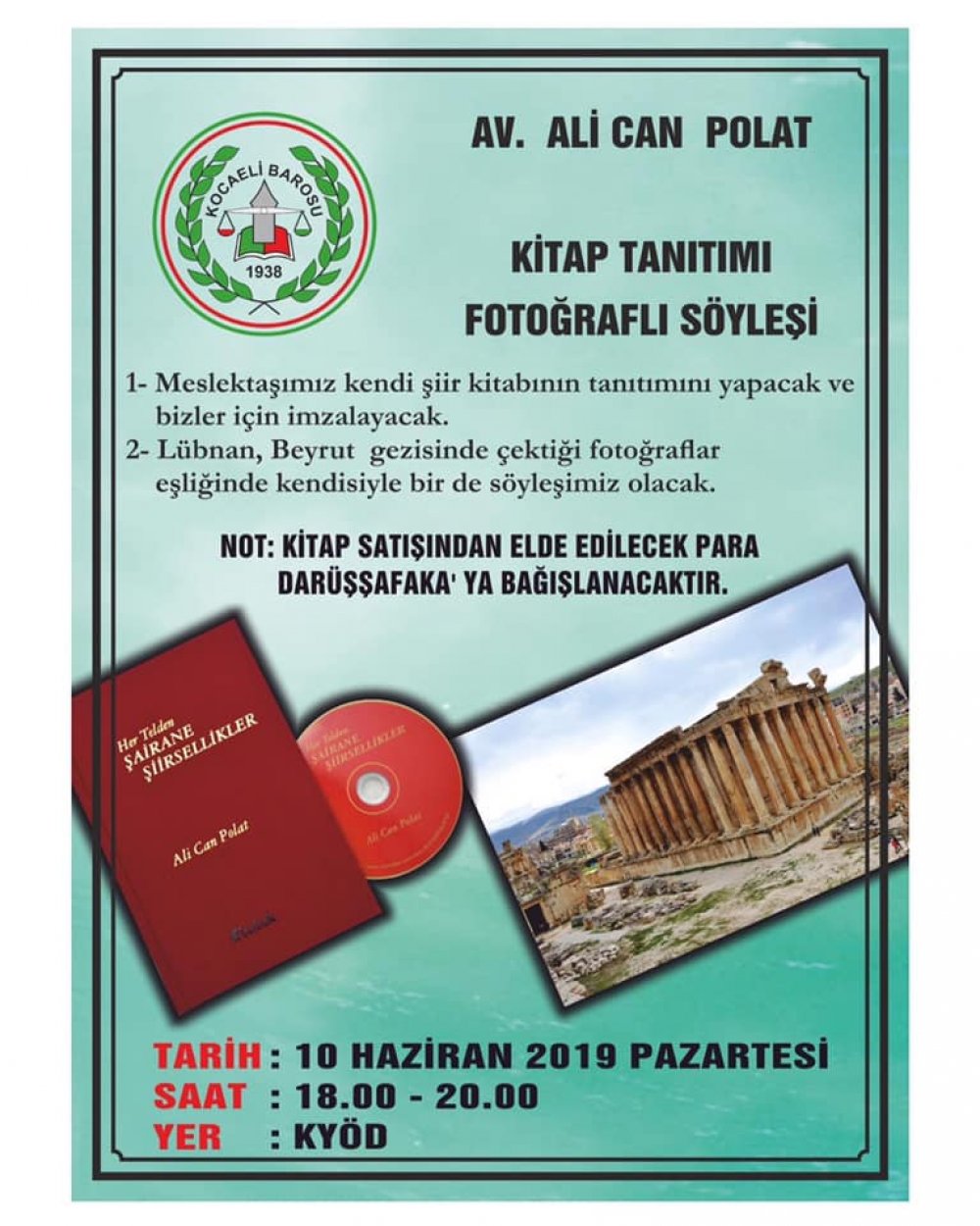Kocaeli Barosuna kayıtlı Av. Ali Can Polat, bu gün saat 18:00’da Kocaeli Yüksek Öğrenim Derneği’nde şiir kitabı olan Her Telden Şairane Şiirsellikler’in tanıtımını yapacak. Tanıtım gününe Polat’ın meslektaşlarının yanı sıra dostları ve yakın çevresi de katılacak. Kocaeli Barosu Başkanı Av. Bahar Gültekin Candemir de Av. Ali Van Polat’a destek vererek sosyal medya hesabından paylaşım yaptı. Candemir’in destek paylaşımı şöyle: “Kıymetli meslektaşımız Av. Ali Can Polat tarafından yazılan “Her Telden Şairane Şiirsellikler” isimli şiir kitabının tanıtımı ile “ Lübnan ve Beyrut konulu gezi fotoğrafları sunumu 10 Haziran 2019 Pazartesi günü 18.00 – 20.00 saatleri arasında Kocaeli Yüksek Öğrenim Derneği’nde yapılacaktır. Meslektaşlarımızın katılımını dileriz.”
