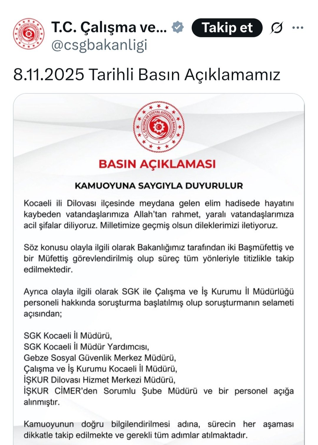 Çalışma ve Sosyal Güvenlik Bakanlığı olayın ardından yazılı açıklama yayımladı.