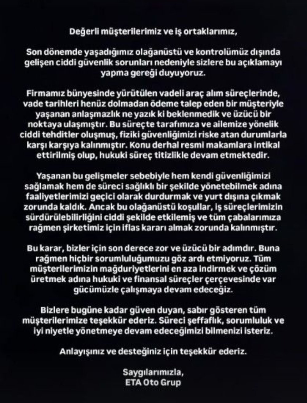 ETA Grup açıklamasında, vadeli araç alım süreçlerinde vade tarihleri dolmadan ödeme talep eden bir müşteriyle yaşanan anlaşmazlığın ciddi tehditlere yol açtığını ve hem firma hem de ailelerinin fiziki güvenliğinin risk altında olduğunu ifade etti. Konunun resmi makamlara iletildiği ve hukuki sürecin devam ettiği bildirildi.