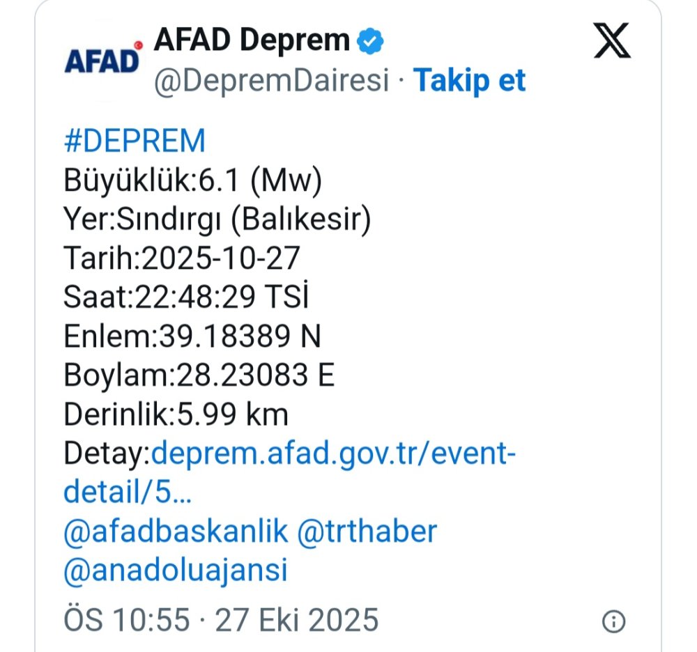 27 Ekim 2025, saat 22.48’de Balıkesir’in merkezinde 6.1 büyüklüğünde bir deprem meydana geldi. AFAD ve Kandilli Rasathanesi verilerine göre, deprem Marmara Bölgesi’nde, özellikle İstanbul ve Kocaeli’de de hissedildi.
