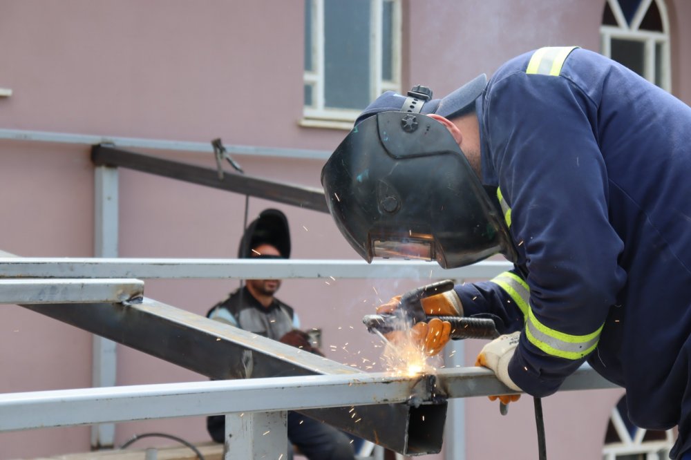Sofuoğlu Camii’nde cuma namazları ve cenaze namazlarında kalabalık olmasından dolayı avluya taşan vatandaşların hava şartlarından etkilenmemesi için yapımına başlanan sundurma çalışması tüm hızıyla sürüyor. Bin 600 kilogram malzeme kullanılarak 60 metrekare büyüklüğünde yapılan sundurma kısa sürede tamamlanacak. Sundurma sayesinde vatandaşlar hem cami avlusunda güneşten ve yağmurdan korunacak hem de açık havada korona tedbirlerine uygun namaz kılabilecek.