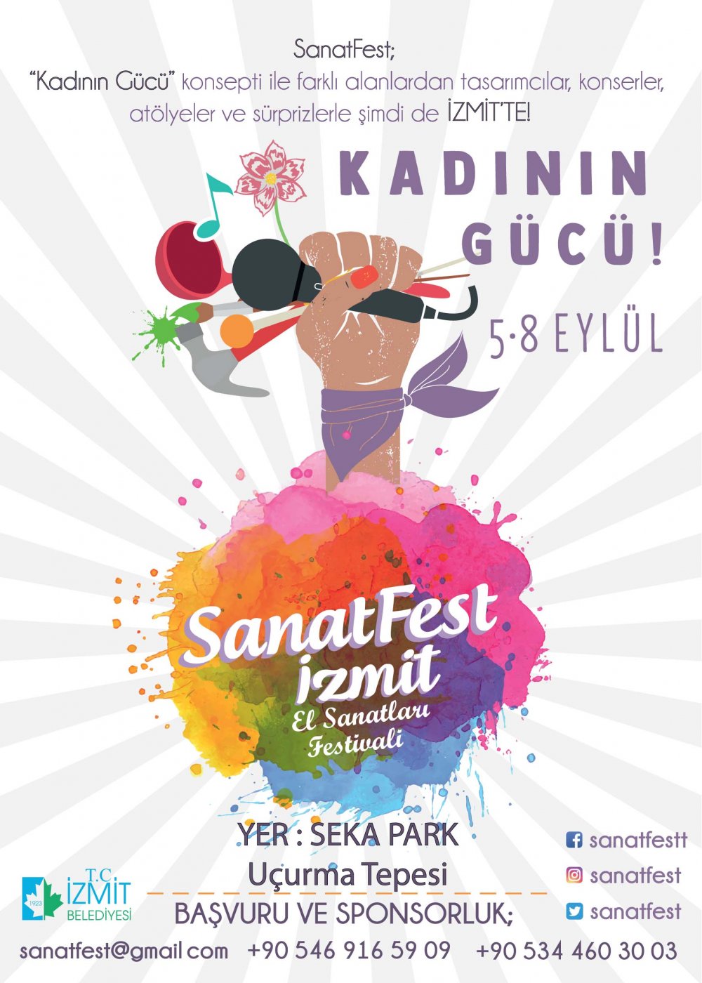 Üretimde kadının gücünü ve önemini göstermek amacıyla oluşturulan konsept altında, İzmitli üreticilere ve esnaflara katkı sağlamak amacıyla İzmit’te ilk defa hayata geçirilen SanatFest başvurularının devam ettiğini belirten İzmit Belediyesi yetkilileri, festivale katılmak ve ürünlerini halkala buluşturmak isteyen İzmitlilerin 0546 916 59 09 ve 0534 460 30 03 numaralardan başvurularını yapabileceklerini duyurdular.