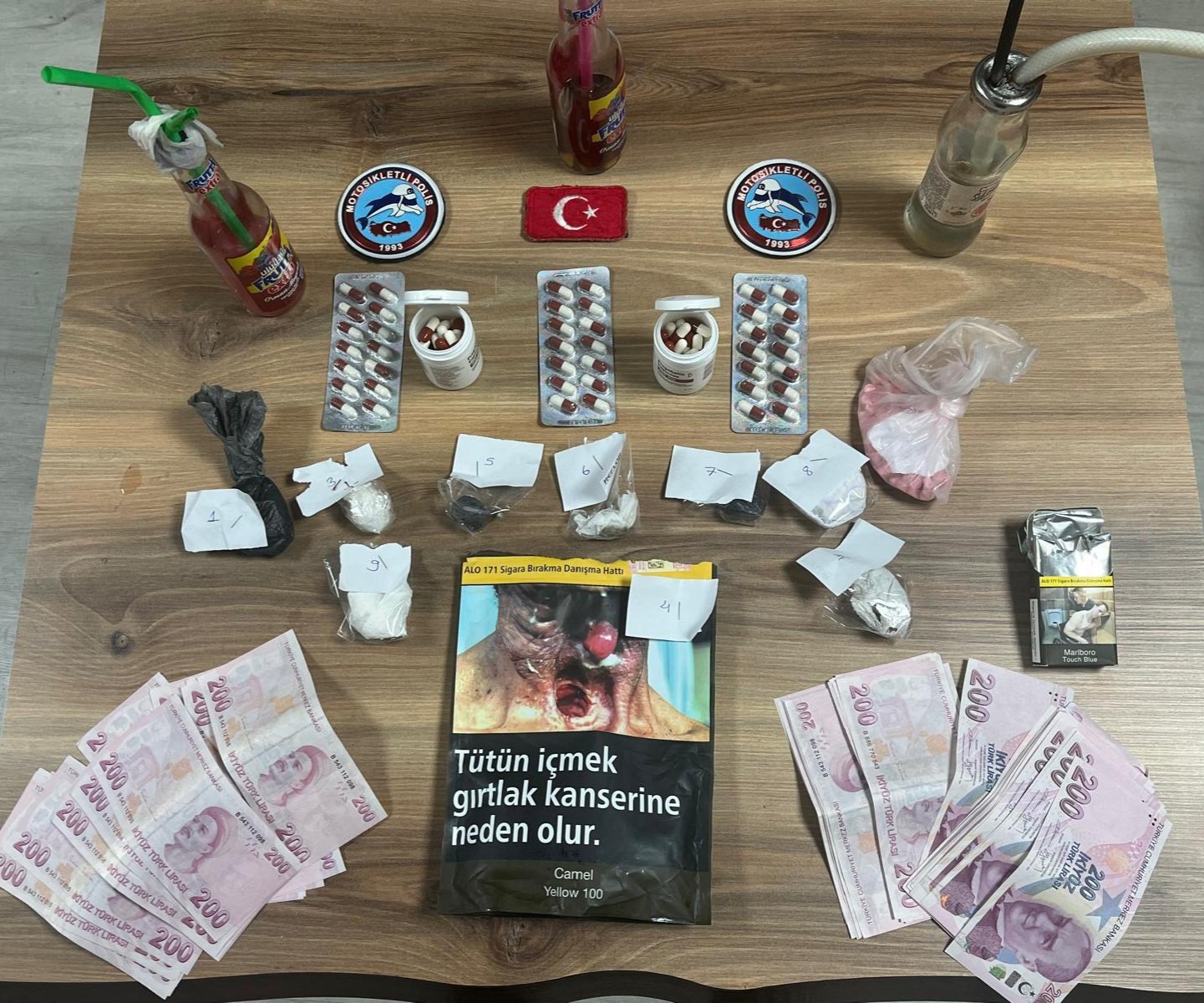 Motosikletli Polis Timleri (Yunus) tarafından durdurulan Y.K. isimli şahsın üzerinde ve ikametinde yapılan aramalarda aşağıdaki maddeler ele geçirildi:59 gram sentetik kannabinoid, 41,26 gram macun esrar, 7,10 gram metamfetamin, 251 adet sentetik hap, 85 adet 200 TL sahte banknot (toplam 17.000 TL), Şüpheli Y.K., adli birimlerce gözaltına alındı.