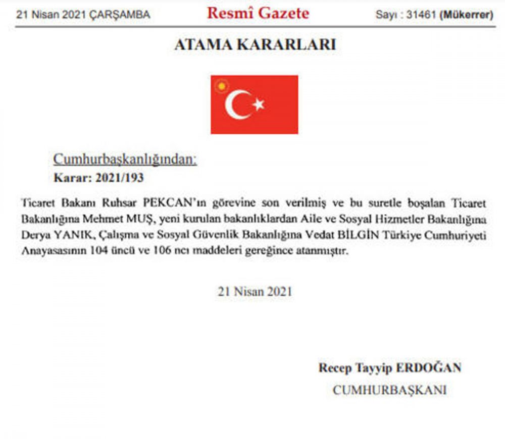 Aile Çalışma ve Sosyal Hizmetler Bakanlığı bölündü. Aile ve Sosyal Hizmetler Bakanlığı ile Çalışma ve Sosyal Güvenlik Bakanlığı'nın kurulmasına ilişkin Cumhurbaşkanlığı kararnamesi Resmi Gazete'de yayımlandı. Aile ve Sosyal Hizmetler Bakanlığına Derya Yanık, Çalışma ve Sosyal Güvenlik Bakanlığına Vedat Bilgin getirilirken, Ticaret Bakanlığına Mehmet Muş atandı.