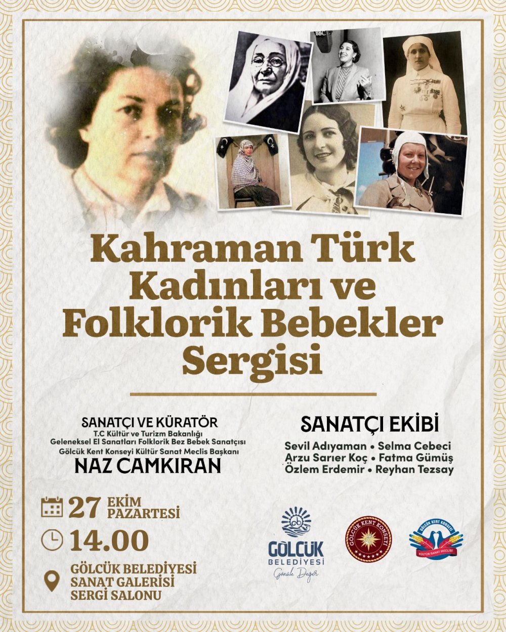 Gölcük Belediyesi ve Gölcük Kent Konseyi işbirliğinde düzenlenecek "Kahraman Türk Kadınları ve Folklorik Bebekler Sergisi", 27 Ekim Pazartesi günü saat 14.00'te Sanat Galerisi’nde ziyarete açılacak.