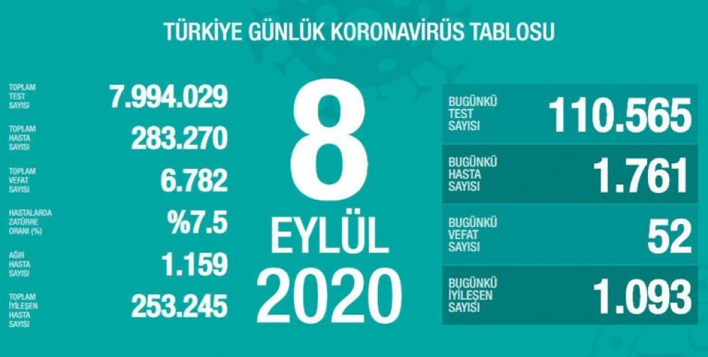 Sağlık Bakanlığı tarafından 8 Eylül koronavirüs tablosu, vaka, test, vefat sayısı ve son durum açıklandı. Türkiye'de son 24 saatte 1761 kişiye Kovid-19 tanısı konuldu, 52 kişi…