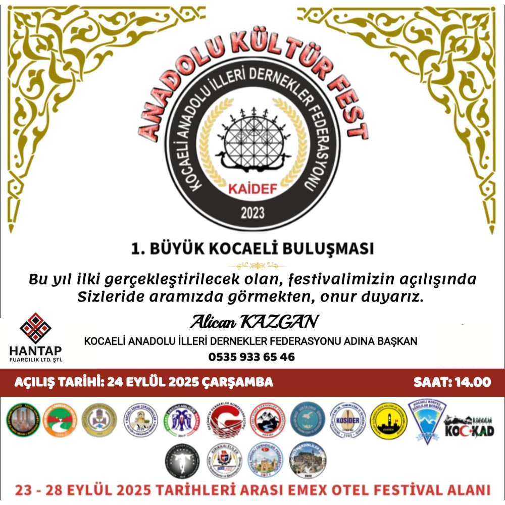 Kocaeli Anadolu İlleri Dernekler Federasyonu (KAİDEF) tarafından bu yıl ilk kez düzenlenecek Anadolu Kültür Festivali, 23-28 Eylül 2025 tarihleri arasında İzmit Emex Otel’de ziyaretçilerini ağırlayacak.