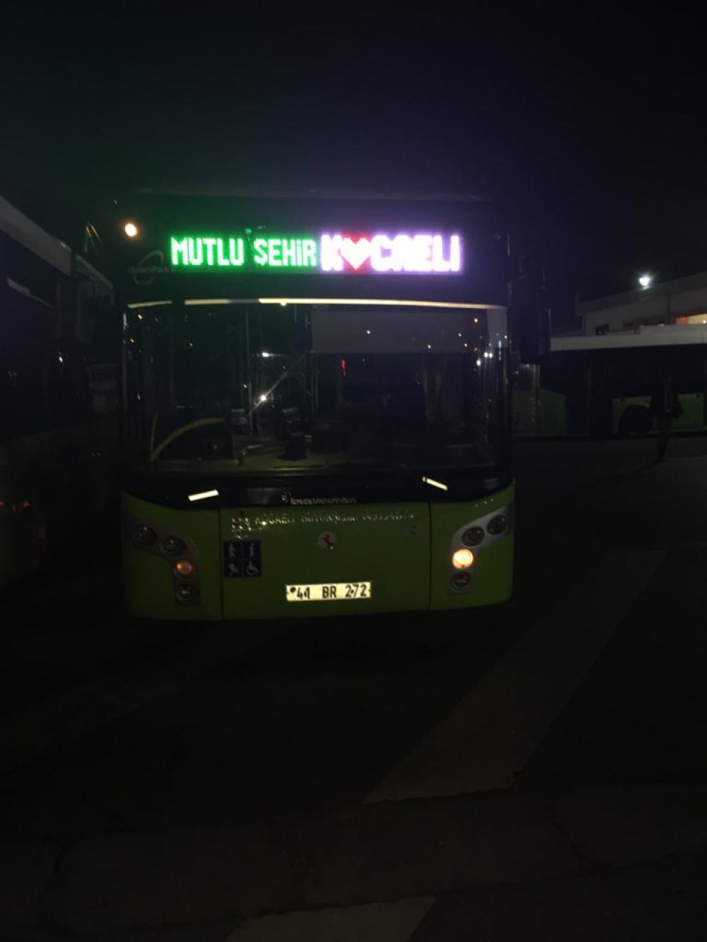 Vatandaşlar tarafından otobüslerin tabelalarında görülen ‘Mutlu Şehir Kocaeli’ yazısı da sosyal medyada sıklıkla paylaşıldı ve otobüsler yolcular tarafından ilgi odağı haline geldi.