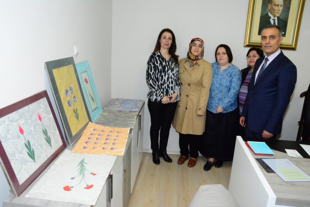 Samimi buluşmada, Geleneksel El sanatlarından Kırkyama (Deri) dalında Usta Öğretici Yasemin Akbulut’a İl Kültür ve Turizm Müdür V. Ercan Yamen, Türk Süsleme Sanatlarından Ebru dalında Neval Ölmez’e İl Kültür ve Turizm Şube Müdürü Hatice Doğancı ve Ebru dalında Özlem Ergün’e de Ebru Eğitim Görevlisi ve Kültür ve Turizm Bakanlığı Halk Kültürü Bilgi ve Belge Merkezine kayıtlı Türk Süsleme Sanatları (Ebru, Tezhip ve Minyatür) Sanatçısı Gülseher Kahraman tarafından sanatçı tanıtım kartları takdim edildi.