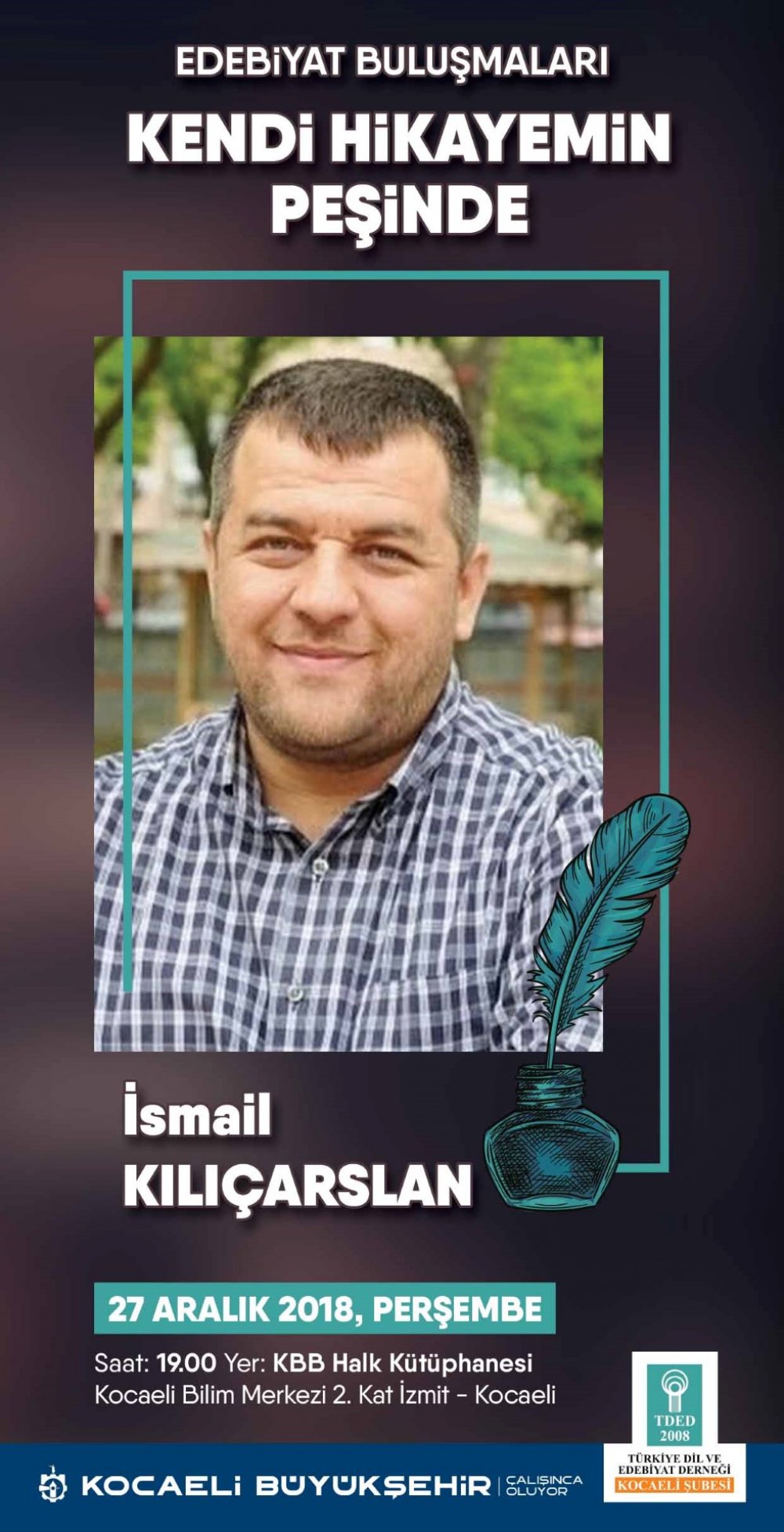 Kocaeli Büyükşehir Belediyesi ve Türkiye Dil Edebiyat Derneği Kocaeli Şubesi tarafından düzenlenen Edebiyat Buluşmaları kapsamında gazeteci-yazar İsmail Kılıçarslan, ‘’Kendi Hikayemin Peşinde’’ adlı söyleşisini 27 Aralık Perşembe günü saat 19.00’da Büyükşehir Belediyesi Halk Kütüphanesi’nde gerçekleştirecek.